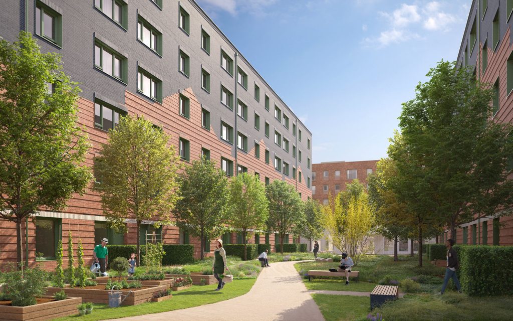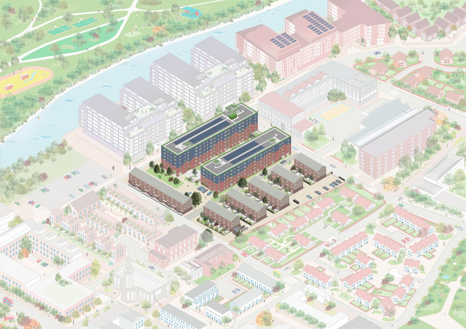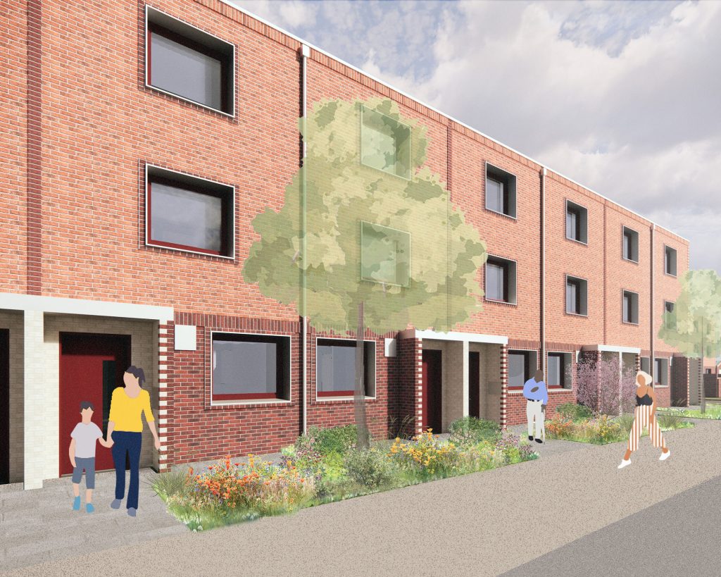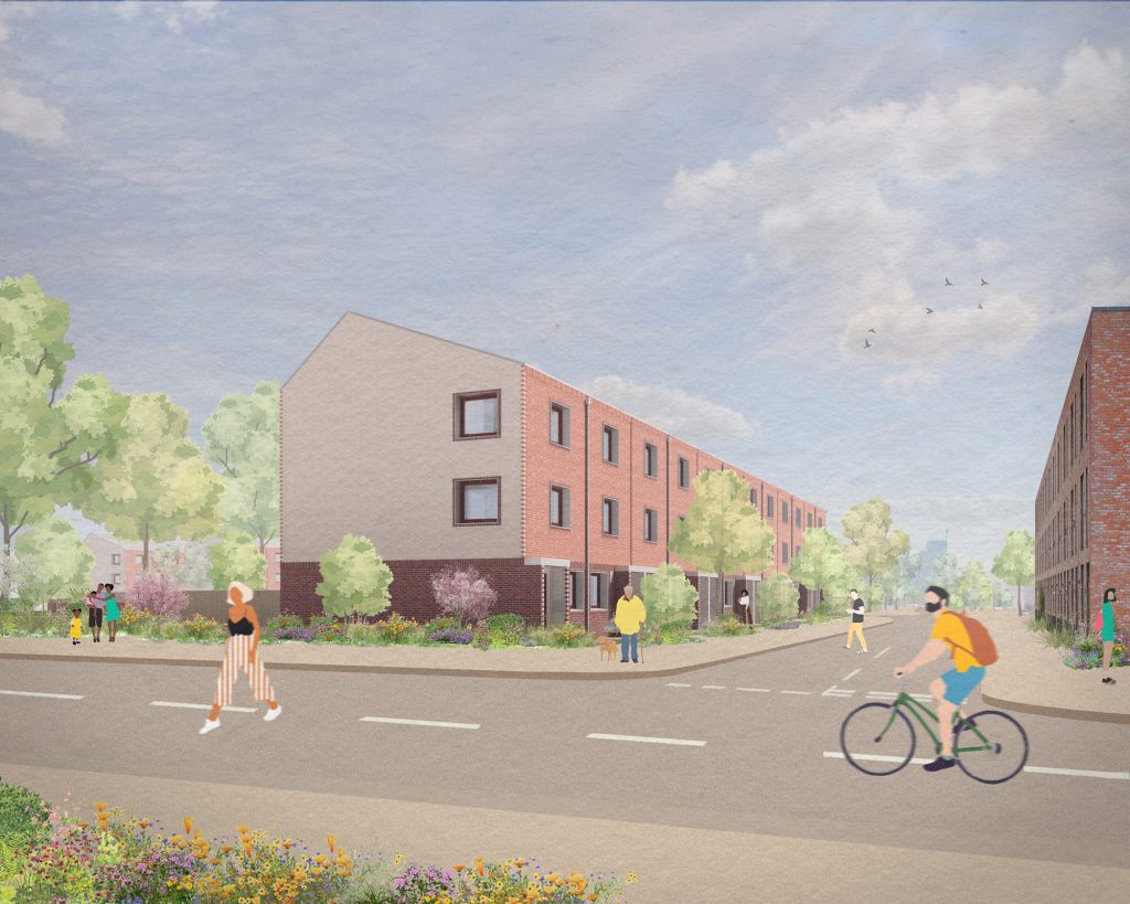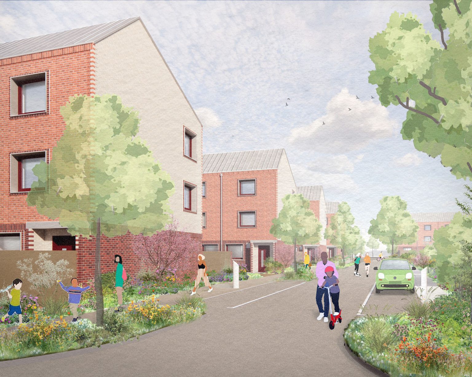 Low-energy homes combining standardised typologies and fabric-first design creating a community-focused neighbourhood.